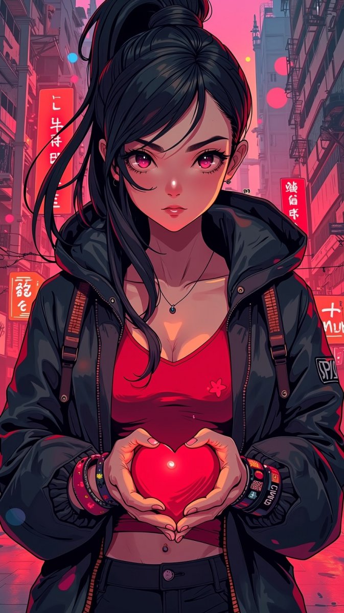 #2. профессиональное фото, спортивная девушка в черной куртке и красном топе, высокая хвостик на голове, яркие глаза и массивные браслеты, в руках красное сердце, светящийся городской фон с элементами готики, игра света на текстуре #role_real