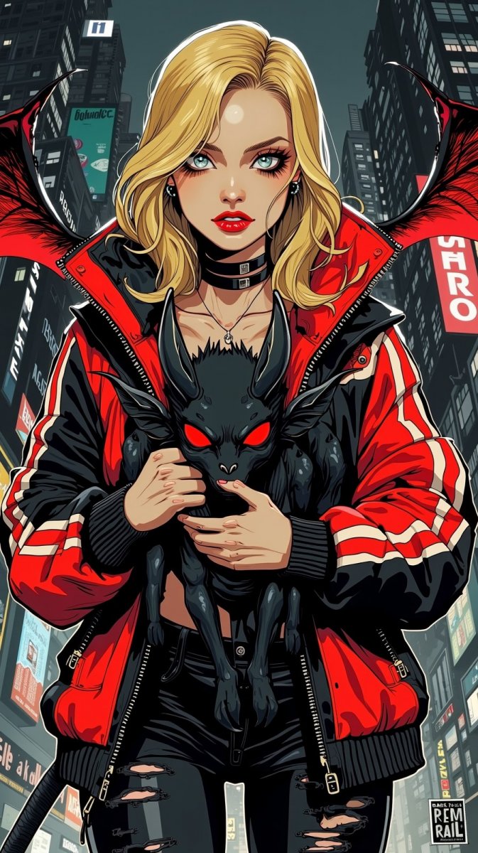 #4. профессиональное фото, бунтующая блондинка в черной и красной неоновой куртке, красные губы и черные ресницы, в руках черный демон с крылами, экстремальный стиль на фоне темного города, глазурь на текстуре снимка #role_real