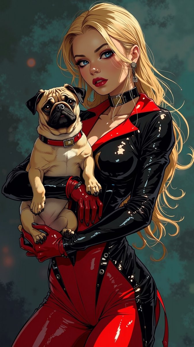 #2. a professional photo of an elegant blonde vamp, black and red neon suit, red and black boots, massive choker with metal inserts, stylish makeup, holding a pug in her hands, softened reflections of light on a darkened background. #role_real