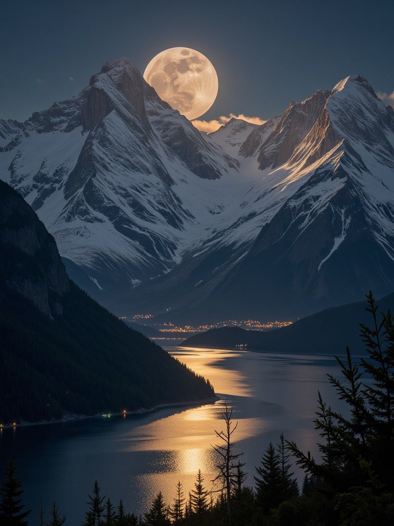 Величественная панорама завораживает воображение, демонстрируя мощный горный хребет, купающийся в мягком свете полной луны. Заснеженные вершины доминируют над пейзажем, отражая серебристый лунный свет и создавая ощущение нереальности происходящего. У подножия гор простирается темная водная гладь, словно бездонное зеркало, в котором отражается небесное светило. Полная луна, сияющий шар, заливает своим светом всю эту удивительную картину. Её мерцающее отражение танцует на поверхности воды, создавая идеальный двойник, усиливающий ощущение глубины и загадочности. Небо плавно переходит от глубокого синего к бархатно-черному, усеянное редкими звездами. Золотистые блики, отражаясь от снежных вершин, придают сцене особую теплоту и волшебство. Вдали, у подножия гор, видны мерцающие огоньки, возможно, принадлежащие городским огням, добавляя нотку человеческого присутствия в этом диком и величественном месте. На переднем плане силуэты растений создают ощущение глубины пространства, приглашая зрителя заглянуть глубже в эту завораживающую картину. Вертикальная композиция подчеркивает масштаб гор и безграничность неба, создавая ощущение восхищения и благоговения перед силами природы. Особая игра света создает атмосферу спокойствия и умиротворения, наполняя зрителя чувством восторга и трепета перед красотой окружающего мира. Цветовая палитра, состоящая из оттенков синего, черного, белого и золотисто-желтого, создает великолепный контраст, усиливающий визуальное воздействие и подчеркивающий гармонию природы. Стиль изображения сочетает в себе элементы реализма и натуралистического искусства, что позволяет зрителю ощутить себя частью этой невероятной сцены, словно он сам находится у подножия величественных гор, созерцая красоту лунного пейзажа
