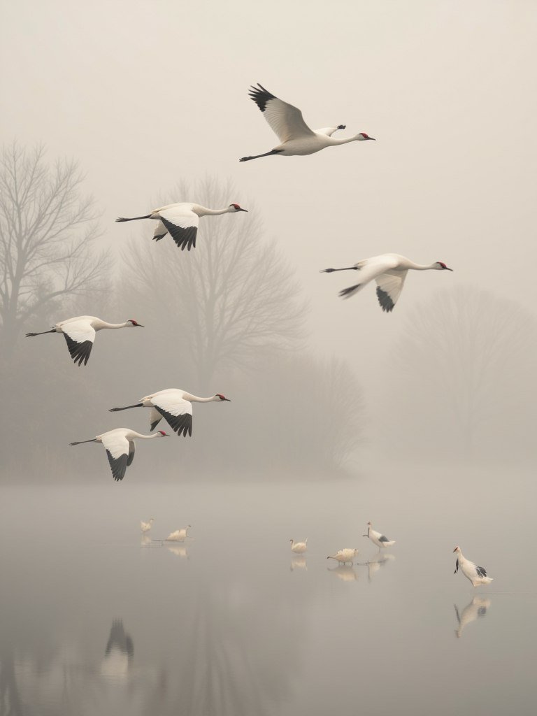 Завораживающая картина передает ощущение спокойствия и безмятежности благодаря вертикальной композиции и приглушенной цветовой гамме. Пять изящных журавлей парят в туманном пейзаже, являясь главным объектом внимания зрителя. Их белоснежное оперение контрастирует с черными пятнами на голове и крыльях создавая выразительный визуальный эффект. Журавли запечатлены в полете с широко распахнутыми крыльями демонстрируя грациозность и легкость движения. Вожак стаи выделяется своим полностью раскрытым размахом крыльев уверенно ведущим остальных птиц. Остальные журавли слегка отстают их крылья находятся в разных фазах полета все они слегка наклонены влево. Фон представляет собой мягкий неземной ландшафт с преобладанием приглушенных оттенков серого и бежевого. Вдали виднеются силуэты голых деревьев частично скрытые густым туманом усиливающим атмосферу умиротворения. На водной глади можно заметить едва заметные отражения птиц еще больше подчеркивающие мечтательную атмосферу произведения. Цветовая палитра тяготеет к монохромности в основном используя оттенки серого белого и черного с легким намеком на теплый свет в верхней части картины. Общее настроение работы умиротворенное и безмятежное вызывающее чувство покоя и гармонии. Стиль изображения напоминает минималистичное японское искусство воплощая красоту простоты и элегантности. Эта картина - ода спокойствию и гармонии с природой