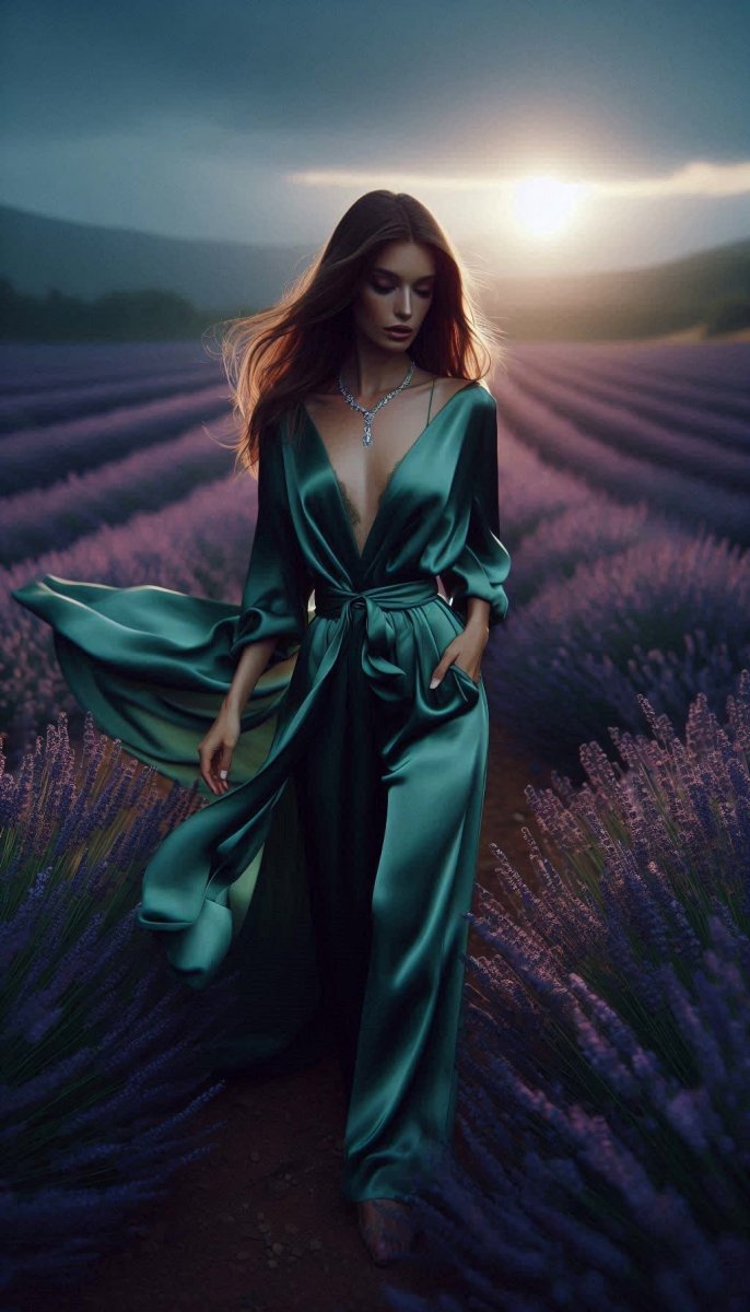 #1 professional photo, hyper realistic, ultra detailed, fashion look, fashion model standing amidst a vibrant lavender field at twilight, flowing emerald green silk pantsuit, delicate silver chain necklace, soft diffused light, romantic and ethereal atmosphere, cinematic feel #role_moda