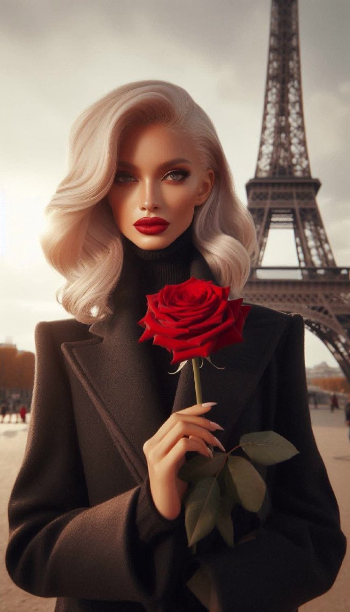 #1. confident platinum blonde model in a sleek black coat, holding a vibrant red rose that matches her bold lipstick, posing against the iconic eiffel tower, warm golden sunlight creating a romantic atmosphere, ultra-realistic detail, cinematic photo style #role_moda