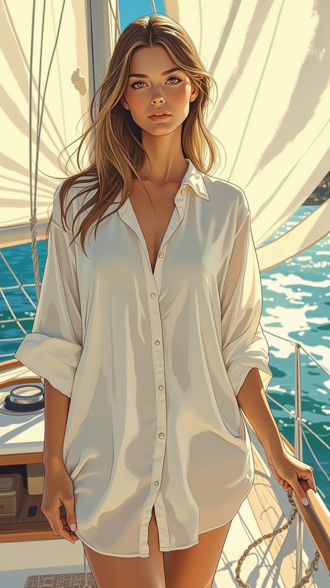 #3. fashion model posed elegantly on the deck of a sailboat, dressed in a lightweight linen beach cover-up, soft sunlight filtering through the sails, water shimmering beneath her, tranquil coastal scene, beautifully detailed, photorealistic, nautical fashion. #role_moda