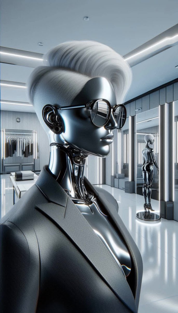 Изображение демонстрирует высококачественный фотореалистичный портрет элегантного гуманоидного робота. Его короткие платиновые волосы и стильные солнцезащитные очки создают образ футуристической утонченности. Робот расположен в минималистичной высокотехнологичной обстановке, где преобладают отражающие поверхности и хромированные текстуры, подчеркивающие его технологическую природу и современный дизайн. Световые акценты мягко играют на металлической оболочке робота, усиливая ощущение гладкости и совершенства. Композиция отличается лаконичностью и вниманием к деталям, что создает эффект присутствия и погружает зрителя в мир будущего. Это не просто изображение машины – это художественное произведение, исследующее взаимосвязь человека и технологии, где робот предстает как объект эстетической привлекательности и символ прогресса. Качество фотографии позволяет рассмотреть мельчайшие детали, от бликов на солнцезащитных очках до текстуры кожи искусственного лица. Контраст между холодным металлом и светлыми волосами добавляет динамики и визуального интереса. Общий тон изображения – спокойный и уверенный, подчеркивающий силу и надежность робота. Эта работа идеально подойдет для иллюстрации научно-фантастических проектов или как элемент современного арт-пространства, демонстрирующий красоту и функциональность передовых технологий. Он словно сошел со страниц комикса или из фантастического фильма, воплощая собой мечты о будущем, где технологии гармонично сочетаются с человеческим дизайном