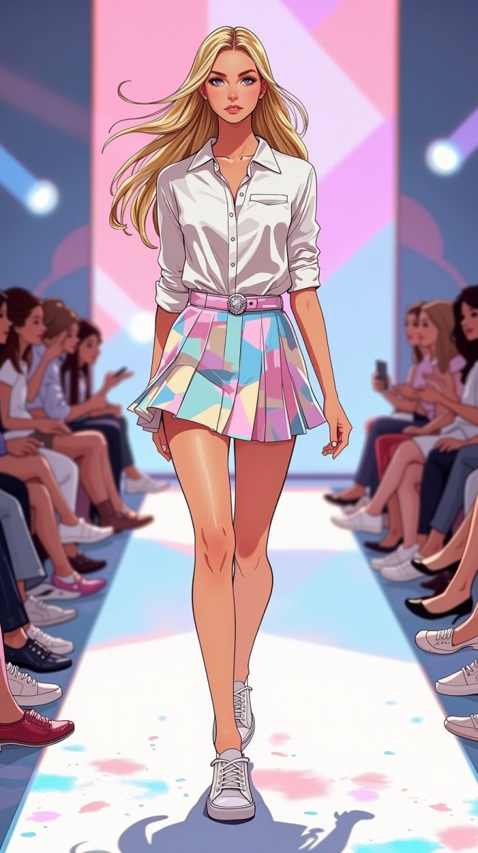 #3 model walking down runway, wearing white button-down shirt with pastel-colored skirt, cinched at waist, high-waisted fit, also wearing white slip-on sneakers, long blonde hair styled in loose waves, bg vibrant with lights and audience #role_moda