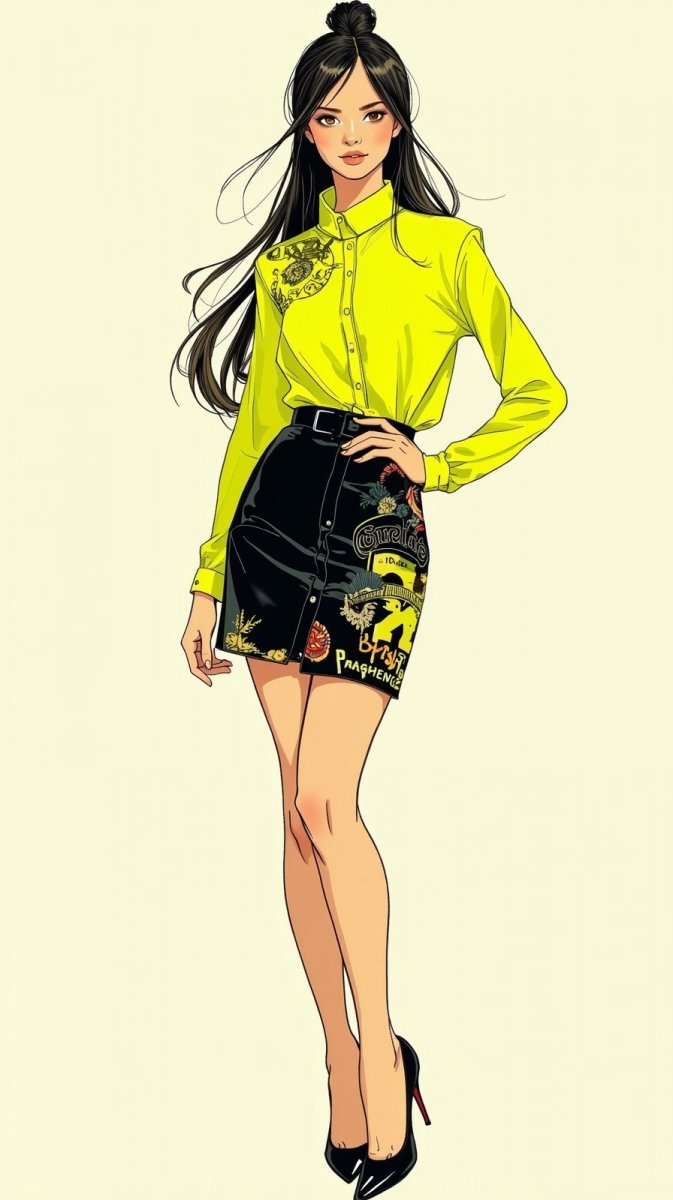 #5. illustration, ink drawing, stylishly dressed in neon canary yellow long-sleeve top with high neckline and black skirt, adorned with graphic prints, wearing black high heels, long dark hair up, soft focus studio lighting enhancing the vibrant colors. #role_fashion_model