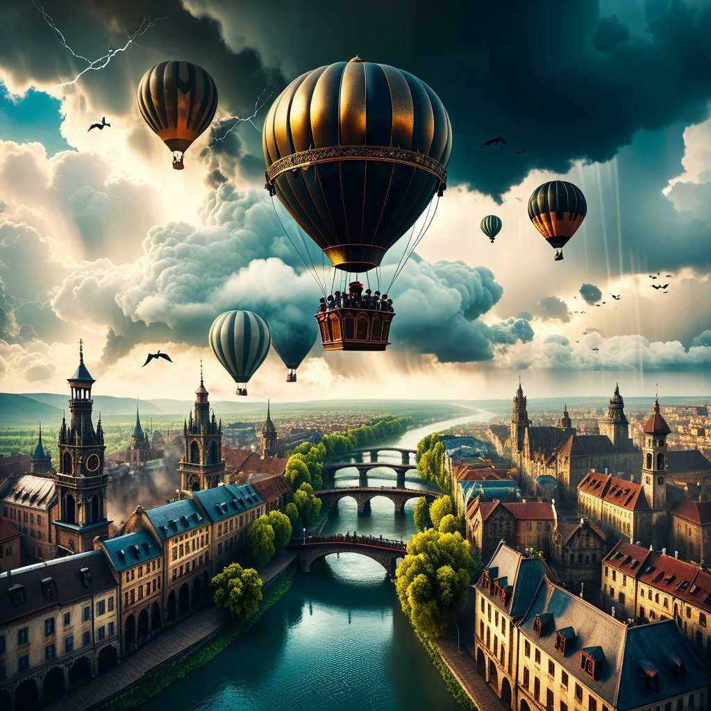 steampunk. on old paper. hot air balloon. above the city. storm thunder lightning, dark clouds. view from the clouds. city river below. bridge. panoramic volumetric. steampunk