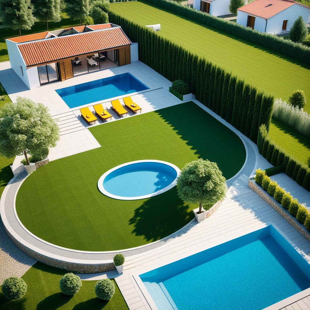 Ландшафтный дизайн участка для загородного дома с бассейном и постройками - Картинка, полученная с помощью нейросети Stable Diffusion