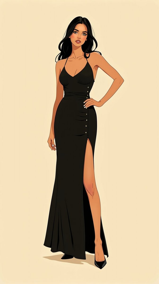 #4. naive art of young woman in long black dress with buttons, high slit, black heels, hair styled in loose waves, posing with hand on hip, background is plain beige #role_moda
