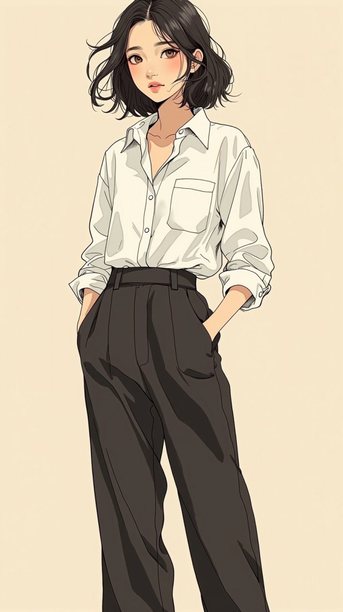 ink drawing of young woman wearing white button-down shirt with lightweight fabric, high-waisted black culottes, relaxed fit, standing with hands in pockets, short dark hair styled in loose waves, BG is plain beige.