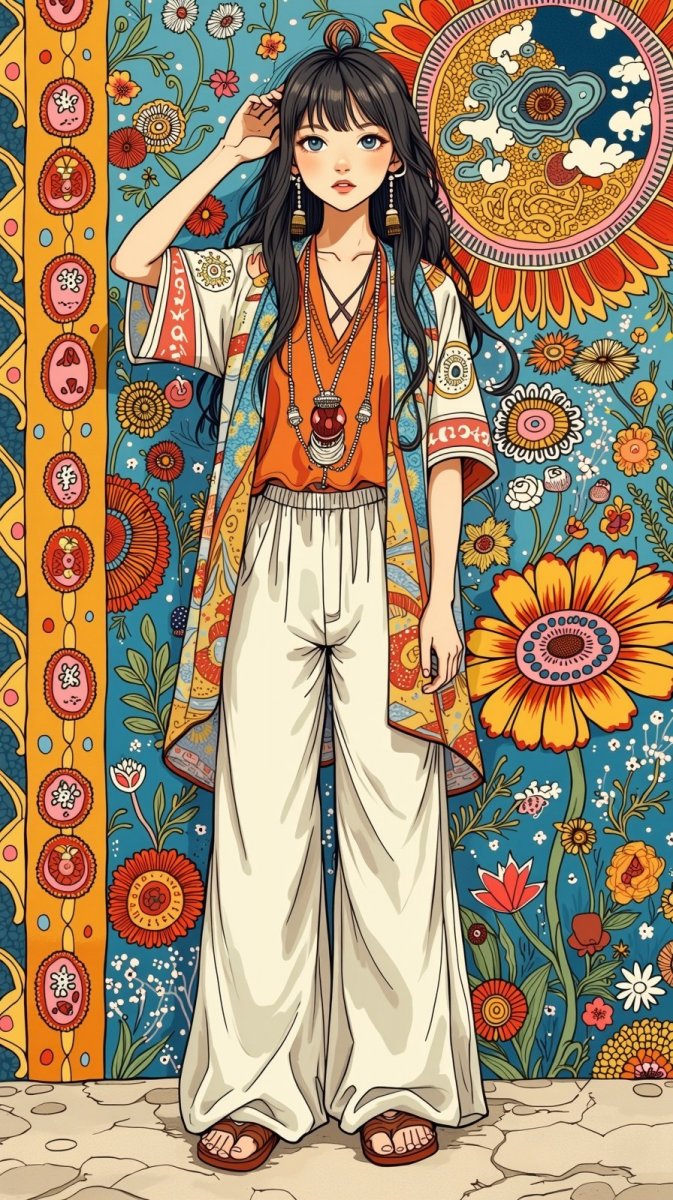 zentangle illustration of a young woman in a layered boho outfit, featuring a loose-fitting kimono and wide-legged trousers, standing next to a colorful mural, hand raised playfully touching her hair, serene yet playful demeanor, bg filled with intricate designs and patterns.