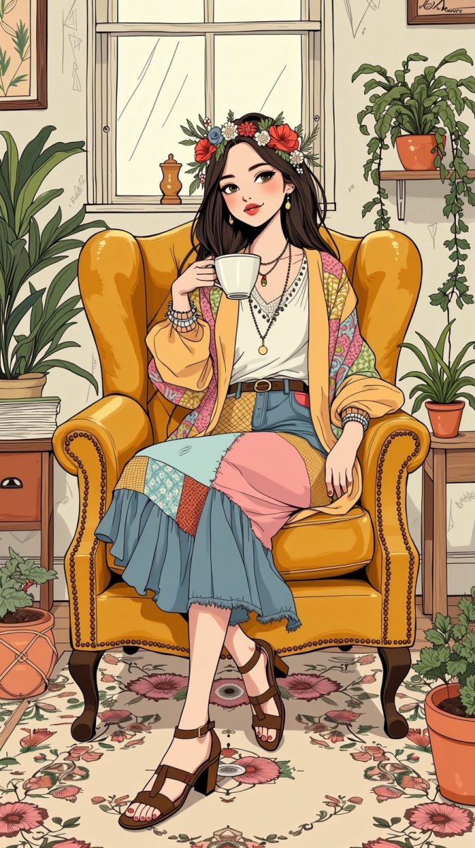doodling of a lady dressed in free-spirited bohemian style, wearing a patchwork skirt and oversized cardigan, lounging in a vintage armchair, sipping herbal tea, adorned with flower crown, whimsical expression on her face, bg with various quirky decor and plants around.