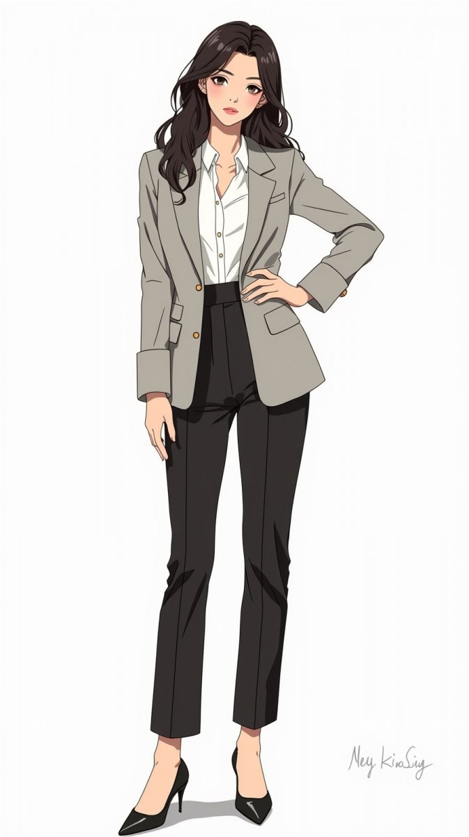 ink drawing, young woman posing in tailored suit, wearing light gray blazer over fitted white blouse, high-waisted black trousers, stylish black pumps, long dark hair in loose waves, looking confidently at camera, bg is plain white.