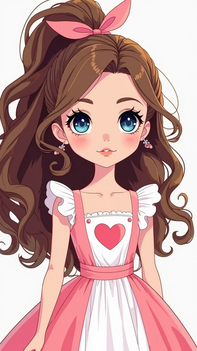 #2. illustration doll with long curly brown hair and blue eyes, wearing pink and white dress with heart-shaped bodice, hair in high ponytail with pink ribbon #role_doll