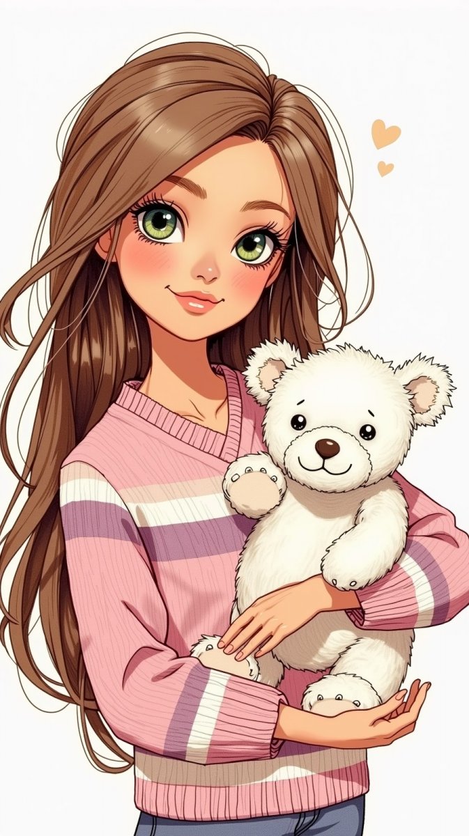 #5. doodling barbie doll holding white teddy bear, wearing pink sweater with purple and white stripes, long brown hair and green eyes #role_doll