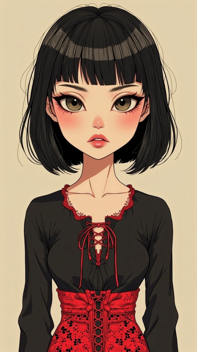 #3. folk art doll with long black hair styled in sleek bob and bangs, wearing black and red crochet dress with lace-up waist detail, serious expression #role_doll