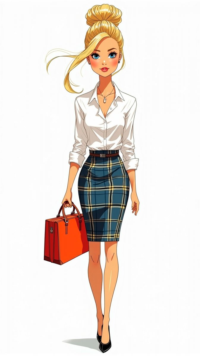 #4. doodling of barbie doll dressed in a professional white blouse and plaid pencil skirt, sporting a stylish updo, stepping confidently while holding a briefcase, vibrant colors accentuating her outfit, bg is white #role_doll