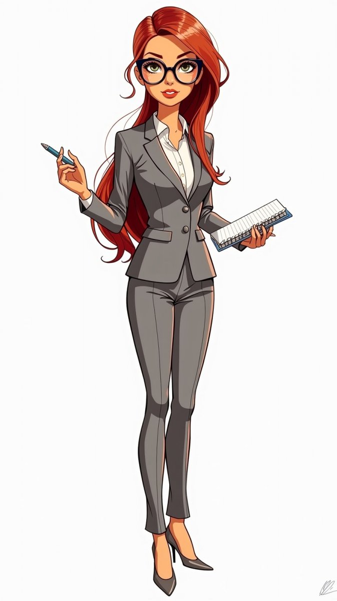 #2. cartoonish illustration of barbie doll in a fashionable gray pantsuit with sharp lapels, long red hair styled in a sleek ponytail, wearing large round glasses, holding a pen and notepad, looking determined, bg is white #role_doll