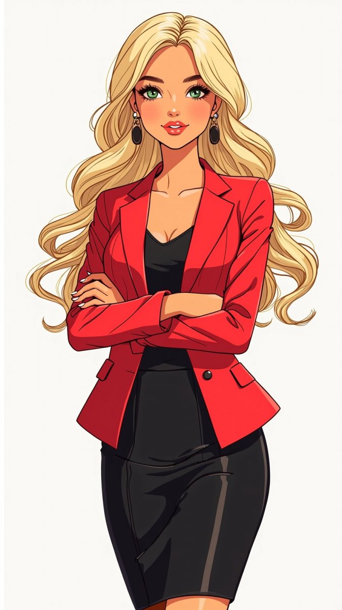 #5. folk art illustration of barbie doll in a bright red blazer over a fitted black dress, long hair cascading in loose waves, wearing statement earrings, standing with arms crossed in a boardroom setting, bg is white #role_doll
