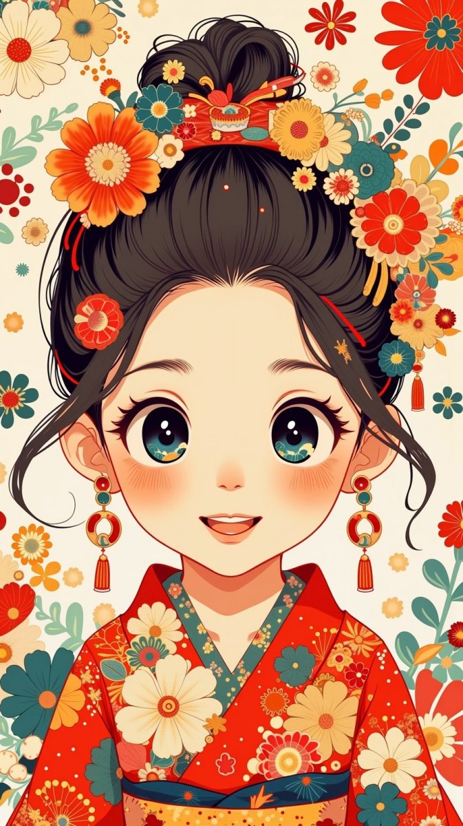 #3 whimsical illustration of an Asian girl in a colorful kimono with a big smile, background filled with playful flowers and vibrant colors, flat design, in a chibi style reminiscent of mingei, featuring large expressive eyes and stylish accessories, bright light and warm hues #role_cute_girl