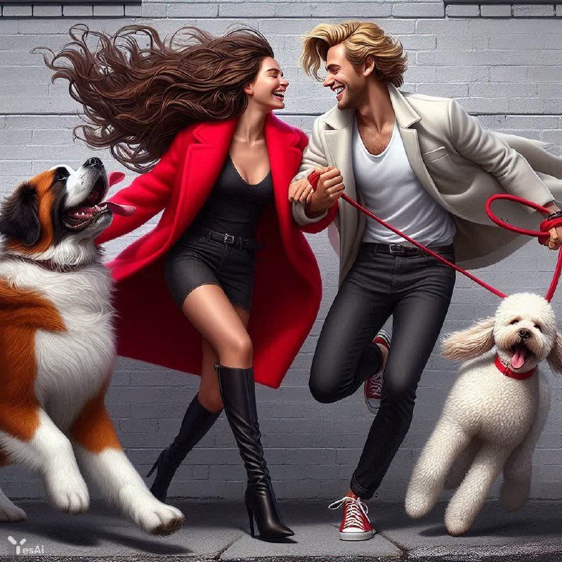 Заснеженный парк в преддверии заката становится сценой для нежной ироничной истории любви. Молодая женщина, облаченная в короткое красное пальто и стильные черные сапоги, с длинными каштановыми волосами развевающимися на ветру, стоит рядом с высоким мужчиной в белом пиджаке и джинсах, чьи светлые волосы мягко обрамляют лицо. Их тела почти соприкасаются, словно подчиняясь невидимой силе притяжения. В центре внимания — очаровательная деталь: пара увязала в игривых объятиях двух собак – добродушного сенбернара и изящного белого пуделя, чьи кожаные поводки переплелись в забавный узел, неловко подталкивая их друг к другу. Этот комичный момент усиливает ощущение близости и взаимной симпатии между героями. Их лица озарены искренним смехом, а взгляд, обращенный к зрителю, наполнен любовью и игривым призывом разделить с ними это волшебное мгновение. Глаза сияют искрами счастья, отражая мягкое золотистое свечение фонарей, рассылающих по парку сказочные блики. Палитра ярких цветов, преобладающих в картине, подчеркнута акцентами красного, золотого и белого, создавая ощущение праздника и волшебства. Каждый элемент композиции – от падающих снежинок до тщательно подобранных деталей одежды героев – работает на создание атмосферы легкой романтики и беззаботного веселья, характерной для жанра комедии положений с элементами гиперреализма. Этот момент запечатлен во всей полноте, демонстрируя полную картину происходящего в парке, где любовь и юмор переплетаются в гармоничный узор