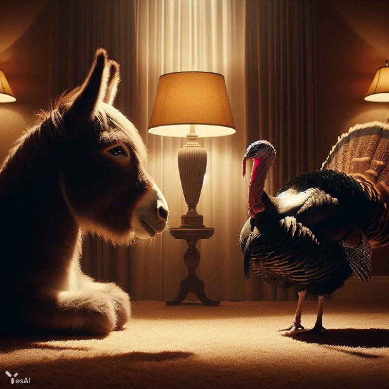 Неожиданная встреча: осел и индейка в уютном зале - Пример изображения из нейросети Dalle 3