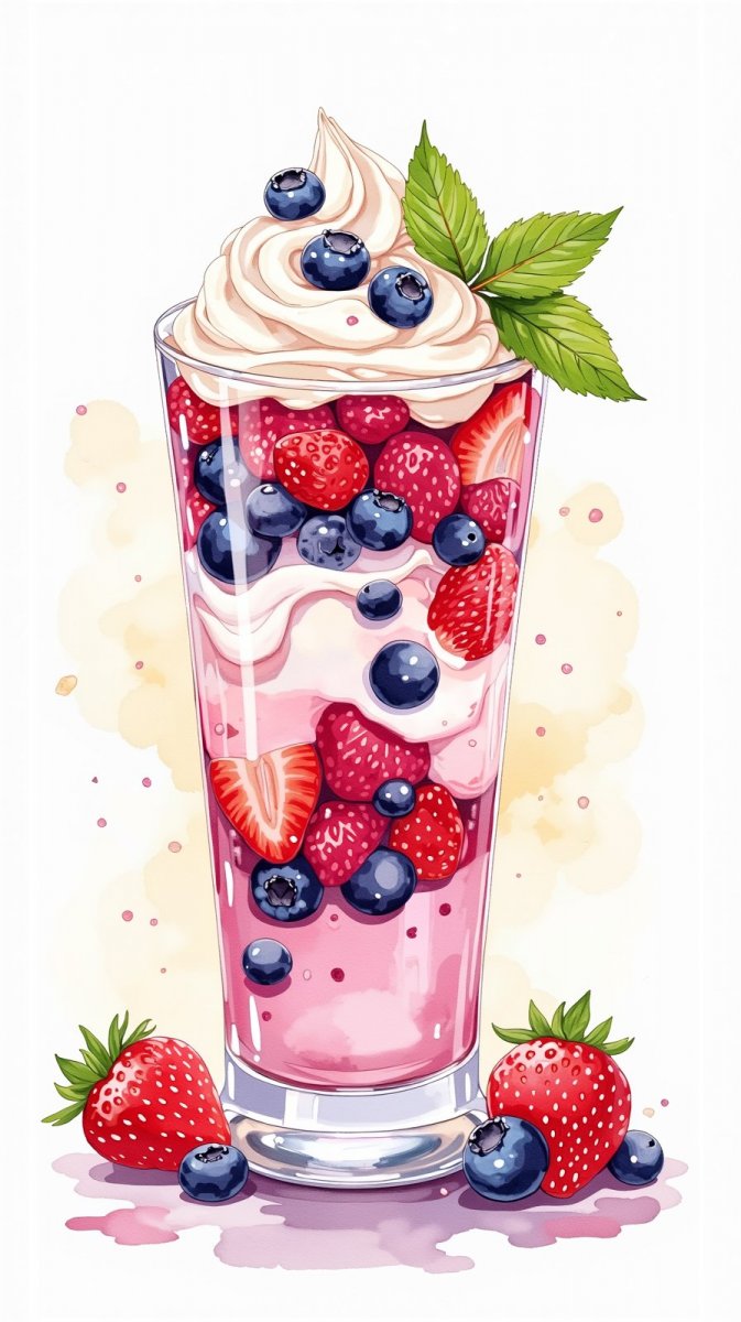 #1 watercolor illustration of mixed berry smoothie in tall glass, vibrant colors with layers of blueberries, raspberries, and strawberries, topped with a swirl of whipped cream, few mint leaves scattered on top, background soft pastel tones #role_watercolor_food