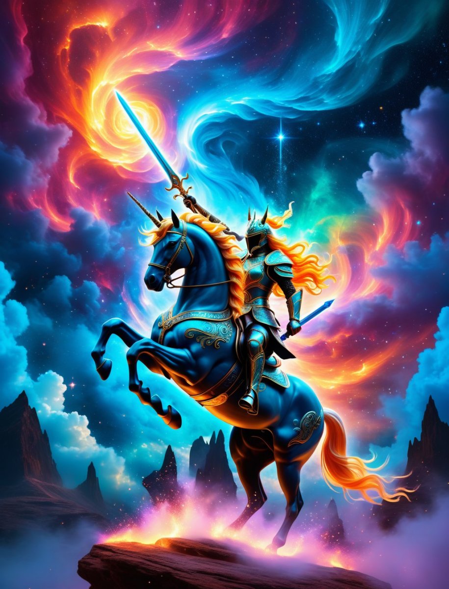 Ethereal nebula backdrop, swirling cosmic dust, bioluminescent flora, crystalline structures, ancient alien glyphs etched in stone, warrior astride a majestic unicorn, fiery sword radiating intense heat, billowing clouds of iridescent vapor, digital painting, vibrant colors, otherworldly glow - Art, CGI, 16K