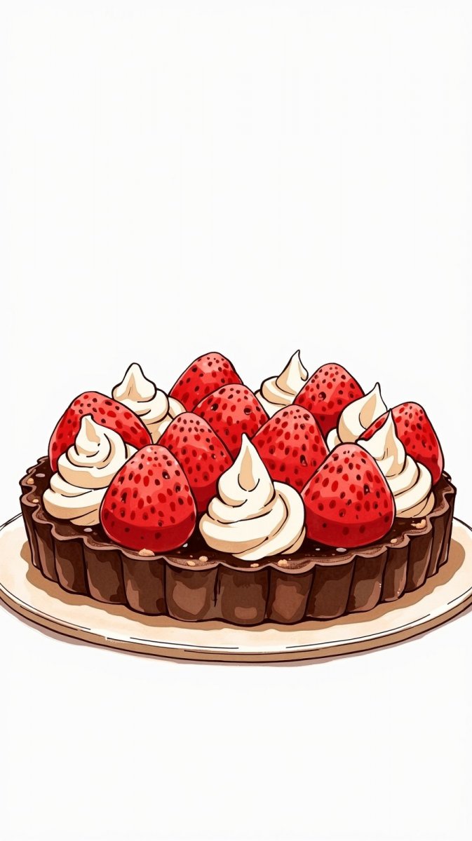 #3 watercolor illustration of chocolate tart with fresh strawberries on top, garnished with dollops of cream, dark crust contrasting with bright red berries, elegant and delicious presentation #role_watercolor_food