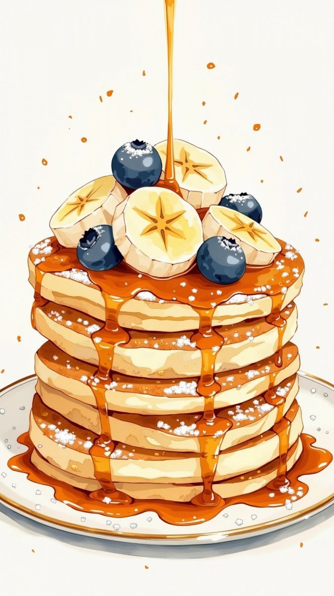 #2 watercolor painting of layered pancake stack with maple syrup drizzled, topped with fresh bananas, blueberries, and a sprinkle of powdered sugar, warm and inviting color scheme #role_watercolor_food