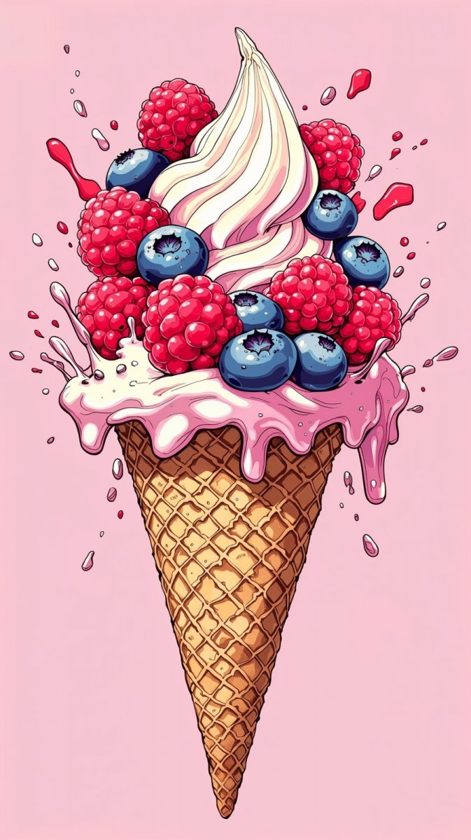 #1. ink drawing of a colorful ice cream cone with vibrant raspberries and blueberries in a splashing arrangement, bright pink BG, photorealistic style, dynamic contrast, beautiful presentation #role_food