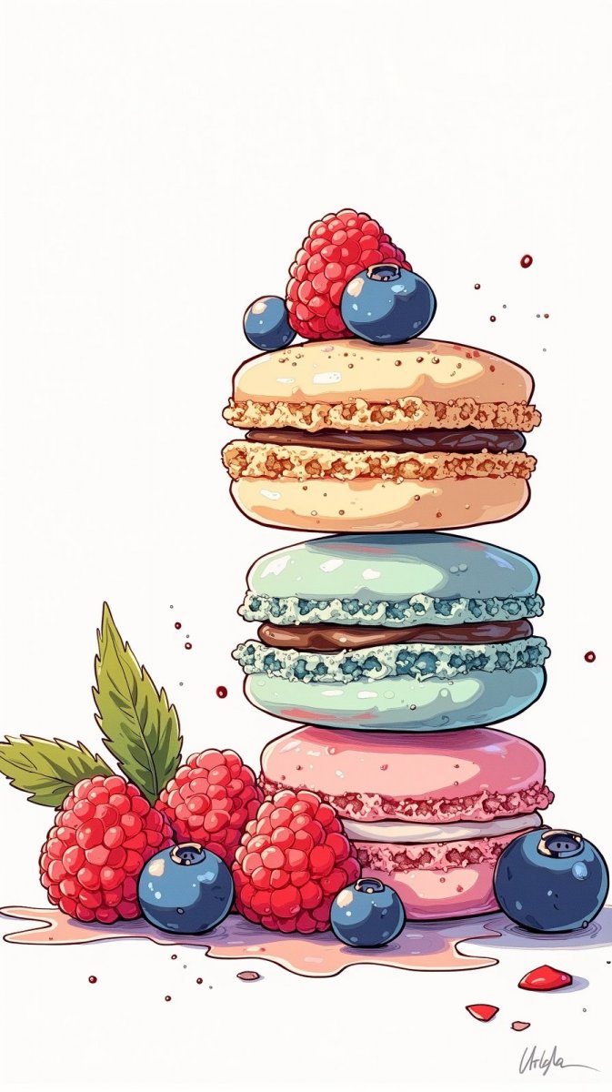 #1. ink drawing of colorful macarons stacked with fresh raspberries and blueberries, soft pastel tones on a white BG, photorealistic details, light reflections, delicate textures, beautiful composition, #role_food