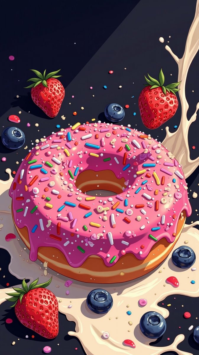 #2. illustration of a vibrant donut with a pink glaze and sprinkles surrounded by berries and splashes of milk, dark BG, HDR effect, high contrast, delicious textures, artistic style, #role_food