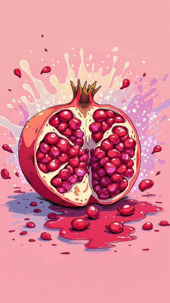#3. doodling of a pomegranate cut in half with juicy seeds spilling out, vivid colors against a pink glittery BG, playful design elements, dynamic splash effect, fresh and appealing aesthetics, #role_food
