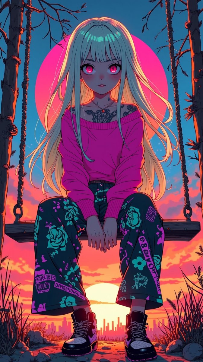 #2. Энергия заката с двойным наложением, девушка с длинными неоновыми волосами и огромными выразительными глазами, в розовом свитере и широких брюках с принтом, сидящая на старом качелях, светящиеся татуировки и неоновая графика вокруг #role_bad_girl
