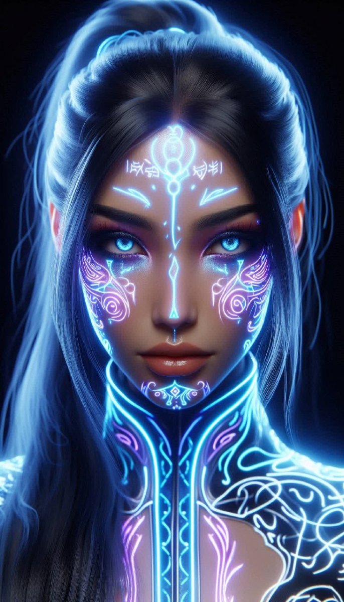 Загадочная воительница, облаченная в сине-белый наряд, украшенный сложными светящимися руническими узорами, воплощает собой силу и тайну. Её длинные темные волосы собраны в высокий хвост, подчеркивая решительный взгляд, обрамленный завораживающим татуированным рисунком на лице. Неоново-голубые и светящиеся пурпурные руны пульсируют мягким светом, словно ожившие древние символы, свидетельствующие о глубокой связи с магией и неизведанными силами. Пронизывающий взгляд серебряных глаз говорит о мудрости и стойкости, готовой к любым испытаниям. Вся её внешность излучает ауру мистики и мощи, представляя собой уникальное сочетание современной эстетики и древних рунных традиций. Она словно сошла со страниц легенды, являясь воплощением энергии и защиты. Сила рун, интегрированных в её облик, создает впечатление неземной сущности, способной управлять стихиями и влиять на ход событий. Этот образ – символ гармонии между человеком и древней магией, сочетающий в себе красоту и силу, загадку и уверенность. Её татуировки - это не просто украшение, а источник силы, позволяющей ей взаимодействовать с миром рун. Она готова к бою и защите того, что дорого, излучая спокойную уверенность и непоколебимость духа
