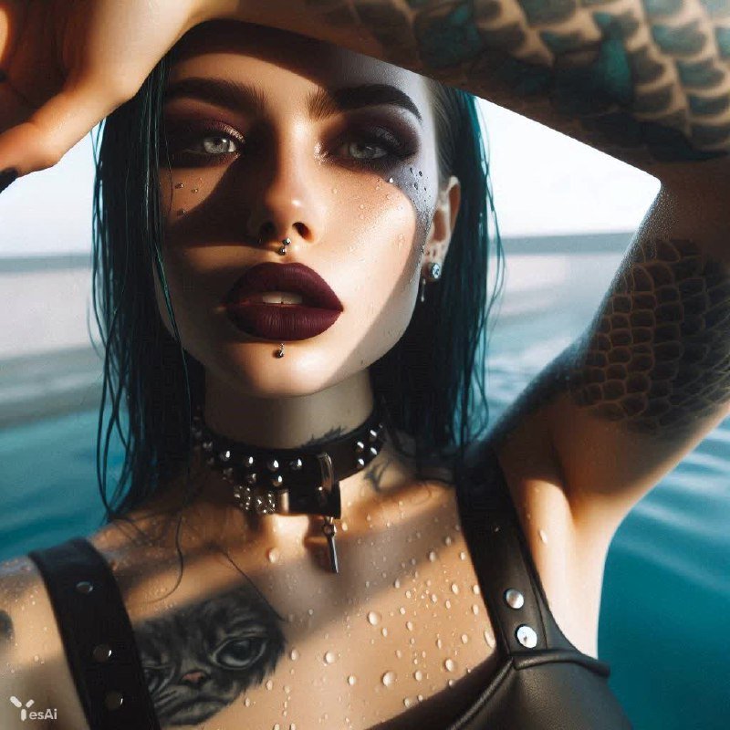 вид через плёнку, Фото на плёнку, игра теней, вид сверху вниз, на фоне не в фокусе светлое нежное небо. Очень красивая woman хулиганка, матовые бордовые темные губы, бледная влажная кожа капли росы под бирюзовой водой, темные синие прямые длинный волосы, чокер с клёпками на шее, на плече светоотражающие тату чешуя, выразительные серые глаза, дерзко смотрит в камеру, чувственная поза в движение рука над головой, на шее ползёт живой большой темно чёрно-бордовый скорпион.знак задиака, космически готично, необычно, драматичное освещение