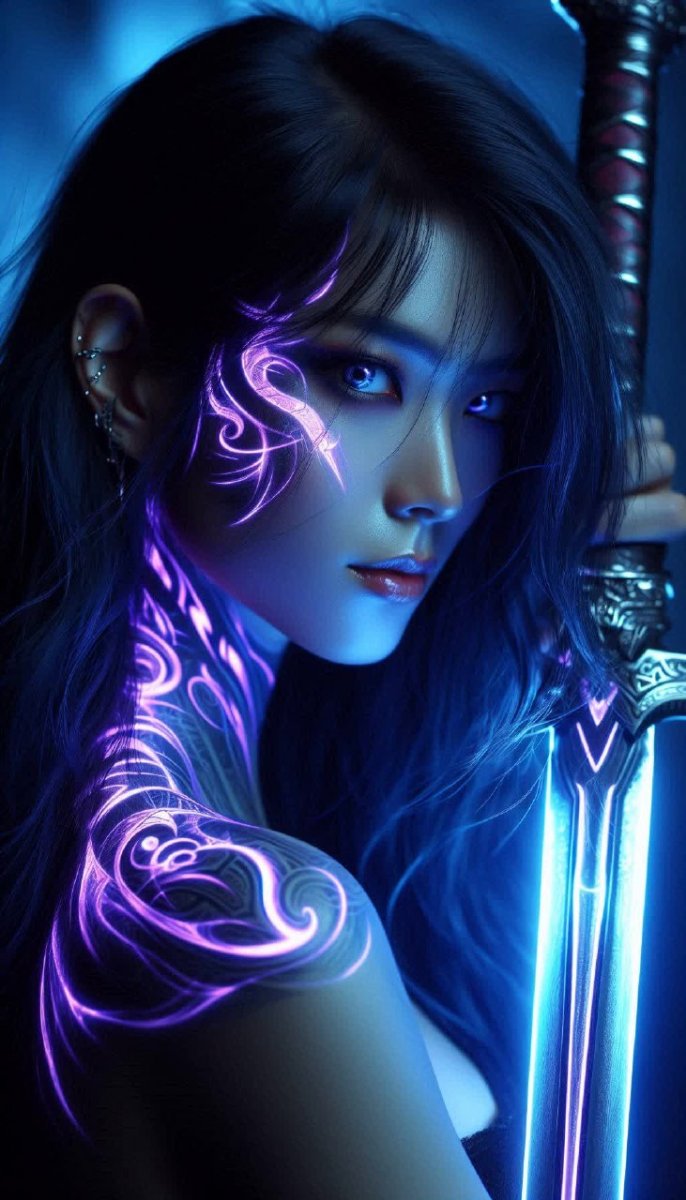 #2 dark hair with luminous rune tattoo, fierce expression holding sword, overall effect, bg blurred, ultraviolet, piercing eyes #role_runes