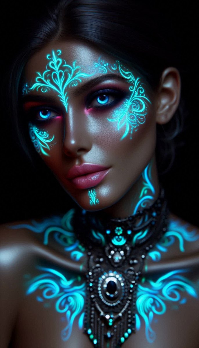 Загадочная красотка с таинственными светящимися татуировками на лице, словно сотканными из неонового света. Её лицо украшают замысловатые узоры, напоминающие древние племенные орнаменты, свидетельствующие о глубокой связи с духами и забытыми ритуалами. Вокруг шеи – массивное колье с крупным, загадочным подвесом, возможно, хранящим в себе тайные символы или являющимся ключом к потусторонним знаниям. Вся композиция пронизана невероятной реалистичностью, каждый волосок, каждая деталь кожи переданы с потрясающей точностью, создавая ощущение присутствия. Пронзительный взгляд говорит о силе духа и внутренней мудрости. Это не просто портрет – это визуальный манифест силы, загадки и мистического очарования, воплощённый в образе современной амазонки, несущей на лице отпечаток древних рун и энергии космоса. Идеальное сочетание современного искусства и язычества. Её образ завораживает и притягивает, словно магнит, заставляя задуматься о глубинных смыслах бытия и тайнах человеческой души. Эта девушка – не просто модель, она – живое воплощение легенды