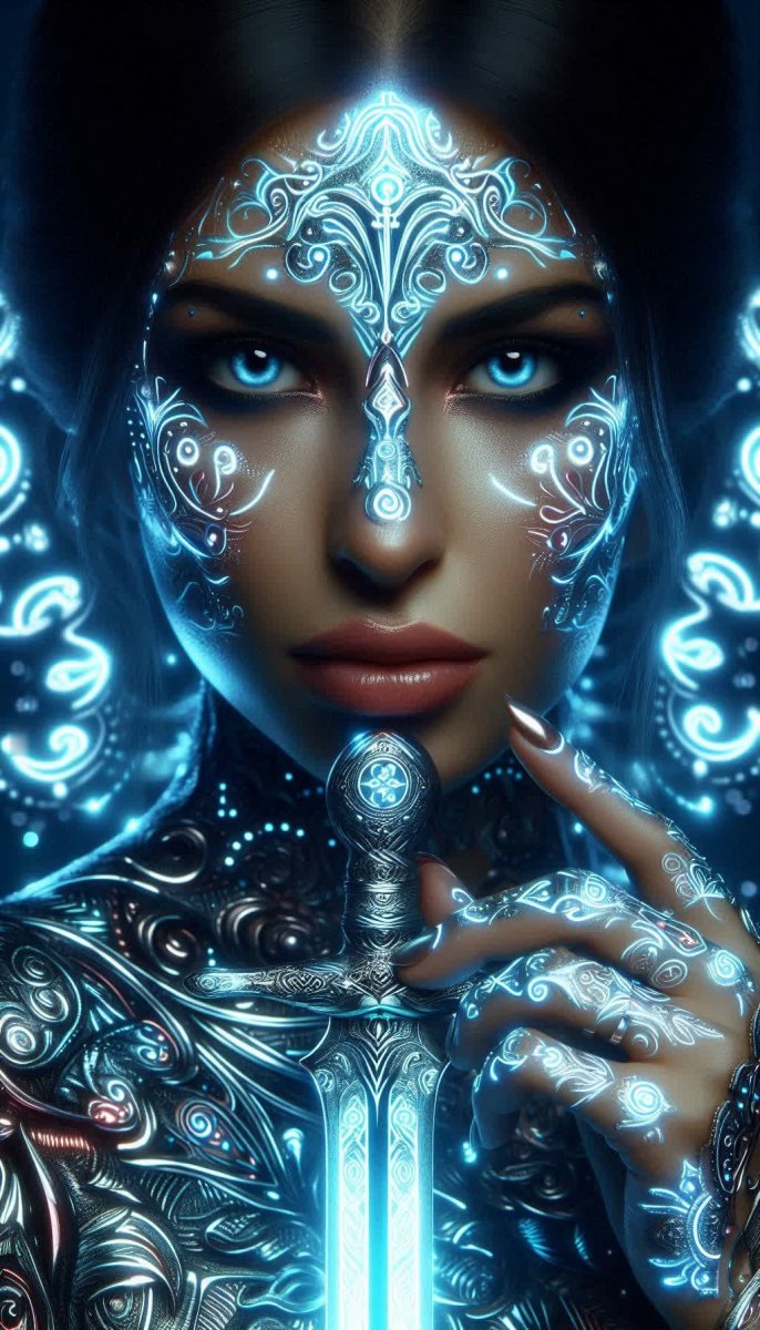 #4. woman, fierce expression holding sword with intricate neon tribal-like sterling silver patterns, face covered in shimmering blue light, glowing runes intricate patterns #role_runes
