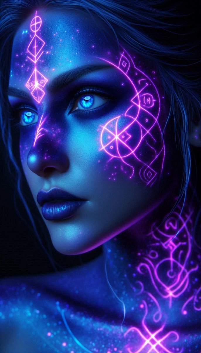 Загадочная женщина с сияющим руническим татуированием в виде неоново-пурпурного символа на лице. Вся композиция пропитана глубокой цветовой гаммой оттенков синего, создавая атмосферу мистики и потусторонней красоты. Изображение выполнено с поразительной детализацией, каждая линия и изгиб татуировки тщательно выверены, а светящиеся элементы придают портрету эффект свечения, словно он излучает собственную энергию. Использование техники кьяроскуро позволяет выделить ключевые черты лица и рунического знака, создавая драматичный контраст света и тени, который подчеркивает загадочность образа. Женщина кажется воплощением древней магии и силы, а ее лицо выражает спокойствие и уверенность, несмотря на необычное украшение. Руны, мерцающие нежным пурпурным светом, намекают на скрытые знания и тайные способности. В целом, работа представляет собой завораживающий визуальный опыт, сочетающий в себе элементы фэнтези, мифологии и современного искусства. Это портрет женщины, связанной с древними силами, обладающей таинственной красотой и неразгаданной судьбой. Изображение передает ощущение монументальности и вечности, а также намекает на глубокую связь между человеком и космосом. Сияние рун создает эффект голограммы, словно они существуют в другом измерении, переплетаясь с реальностью