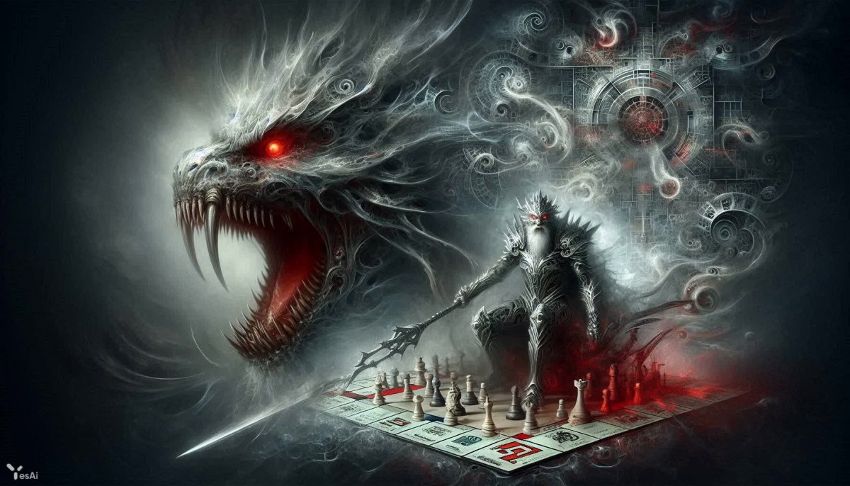 Загадочное столкновение миров: мрачный тональный фон окутывает серебристый туманный фрактал, где из глубин проявляется зубастый хищный монстр с горящими красными глазами, воплощающий зло. На фоне этой зловещей сцены разворачивается игра в монополию, символизирующая борьбу за власть и контроль, отмеченная брызгами алой краски и сложными фрактальными узорами. В центре композиции предстает биомеханический воин с бородой, облаченный в серебристые леггинсы и вооруженный пушкой – символ мощи и технологического прогресса. Старик с седой бородой, крепко держащий оружие, бесстрашно смотрит демону прямо в глаза, словно готовый принять вызов судьбы. Эле...