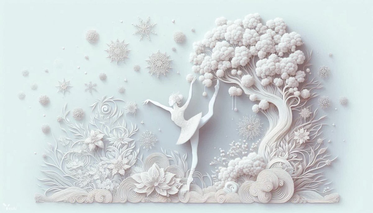 Изысканная композиция, сотканная из нежных оттенков и воздушных линий, воплощает собой идеал чистоты и хрупкости. В центре внимания – белоснежное дерево с цветущими ветвями, словно сошедшее со страниц волшебной сказки. Его тонкие, витиеватые линии создают ощущение невесомости и грации, а пушистые элементы придают образу объем и мягкость. Рядом изображена юная гимнастка в леггинсах, утопающая в снежинке из белого света. Ее фигура словно растворяется в пастельных тонах, подчеркивая легкость и плавность движений. Вся картина пронизана эстетикой минимализма и элегантности, где белый цвет является доминирующим оттенком. Игра света и тени создает эффект сияния и объемной глубины, а плавные волны шелка добавляют текстуры и тактильности. Белое на белом – это не просто цветовое решение, но и символ чистоты, невинности и бесконечности. Общее впечатление от произведения – ощущение сказочного мира, наполненного красотой и гармонией. Это визуальное воплощение мечты о совершенстве, где каждая деталь продумана до мелочей, а переходы между линиями и формами максимально плавные и слаженные. Картина излучает спокойствие и умиротворение, приглашая зрителя в мир эстетического наслаждения и безмятежной красоты. Белоснежное сияние заполняет пространство, создавая атмосферу волшебства и нежности. Это произведение искусства – ода белому цвету и его многогранности