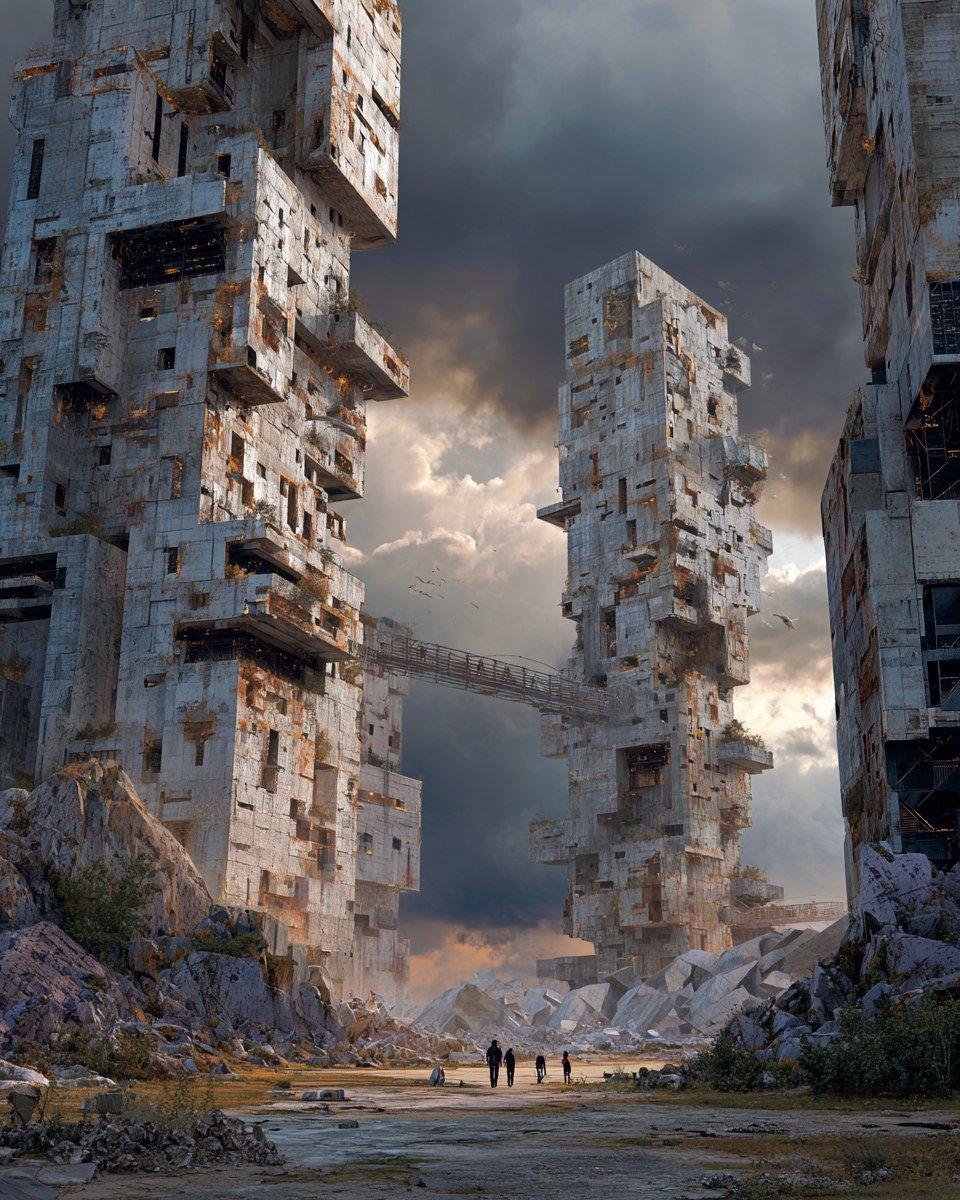 Заброшенный мегаполис будущего – мрачный памятник ушедшей эпохе, возвышающийся над пепельными равнинами апокалипсиса. Монументальные бруталистские здания из грубого бетона, словно выросшие из земли, образуют лабиринт разрушенных улиц и проспектов. Среди них выделяется уникальное сооружение, стилизованное под русскую букву 'И', свидетельствующее о былой гениальности архитекторов, теперь навсегда затерянной в тумане времени. Здания, пораженные временем и катастрофой, демонстрируют зияющие трещины, торчащую арматуру и сквозь щели пробивающуюся дикую растительность – признаки борьбы природы с рукотворным миром. Прозрачные стеклянные панели, стальные модули и переработанные мосты, интегрированные в бруталистскую структуру, добавляют композиции сложный визуальный ритм, подчеркивая сочетание модернизма и разрушения. Небо над городом затянуто плотной пеленой пепельных облаков, сквозь которые пробиваются слабые лучи закатного солнца, отбрасывающие причудливые тени на руины. Внизу, среди хаоса, виднеются небольшие фигурки выживших, использующих дроны для обследования местности – символ надежды и борьбы за существование в этом враждебном мире. Холодная палитра серых оттенков металла и бетона контрастирует с ржавыми акцентами оранжевого цвета и вспышками зеленой растительности, а пыльный золотистый свет создает ощущение гнетущей атмосферы и надвигающейся опасности. Кинематографичная композиция, детализированный рендеринг и реалистичная перспектива погружают зрителя в этот постапокалиптический мир, где прошлое встречается с будущим, а надежда сталкивается со смертью