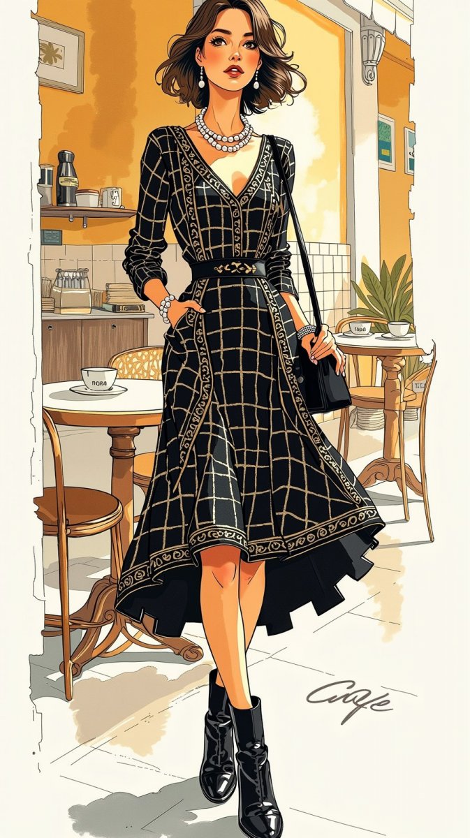#5 Ink drawing, illustration, digital watercolor and gouache, bold black outlines, translucent saturated color gradients featuring a sophisticated woman inspired by Coco Chanel and Miuccia Prada. She wears a classic black tweed dress with intricate gold threading and a modern twist—a high-low hemline that flows gracefully, paired with chunky patent leather ankle boots. Complementing her look are statement pearl earrings and a structured handbag, while her serene expression and softly tousled hair exude timeless elegance and contemporary flair, surrounded by a chic café atmosphere. #role_design