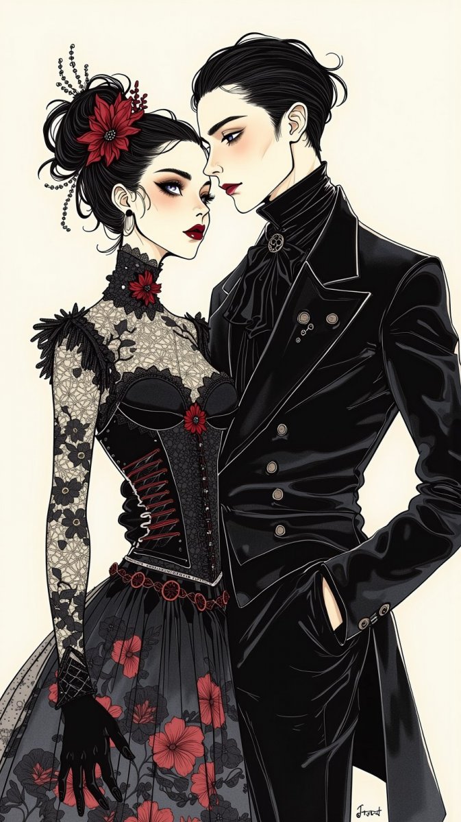#1 Ink drawing, illustration, digital watercolor and gouache, bold black outlines, translucent saturated color gradients depict a fashionable couple representing the goth subculture. The woman wears a flowing black lace dress reminiscent of Alexander McQueen, with intricate floral embellishments and a corseted waist. The man is styled in a sharp, Victorian-inspired black suit with subtle sheen, taking cues from John Galliano’s theatrical flair, complete with a dark velvet cravat. Their poses are intimate and confident, with the woman’s dark eyeliner and deep crimson lips ...