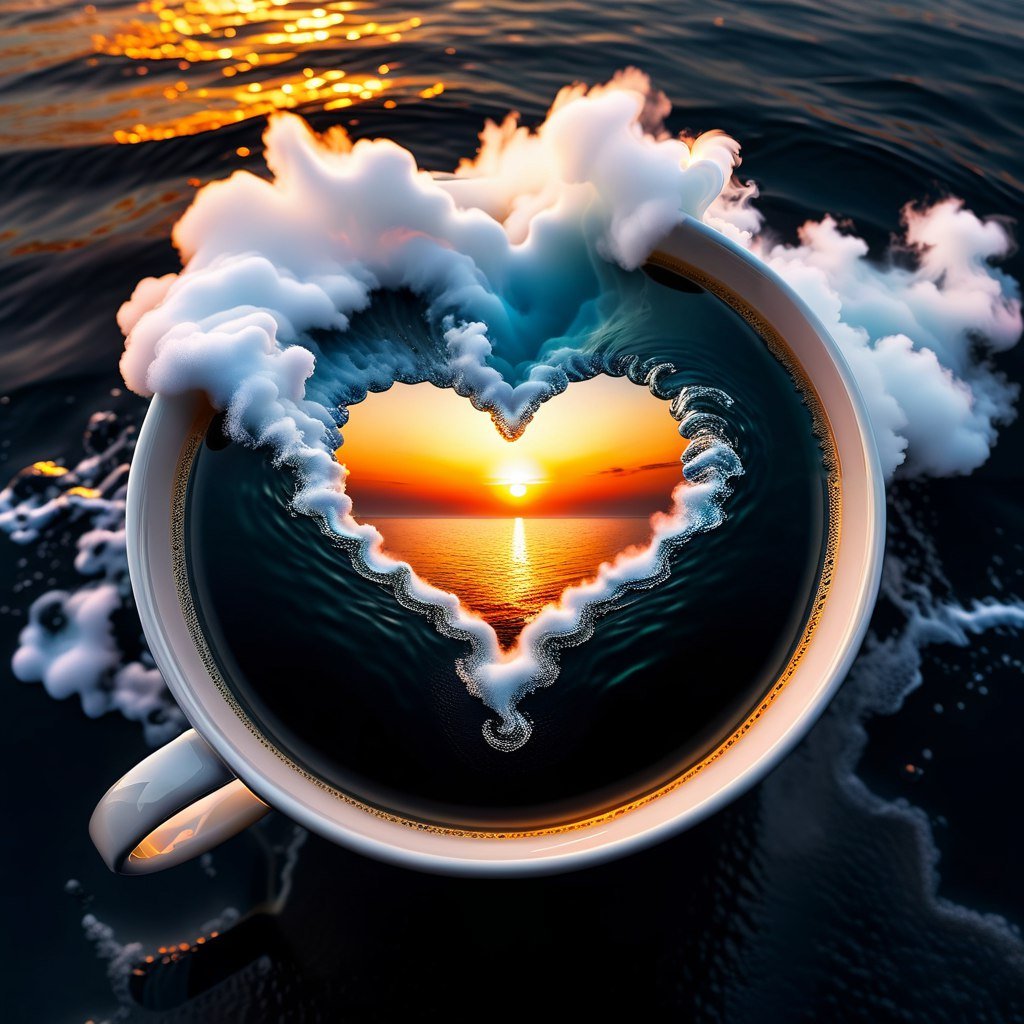 stable diffusion Морская симфония в чашке: трехмерный взгляд на закат и пар. Изображение из нейросети Стейбл Дифьюжн