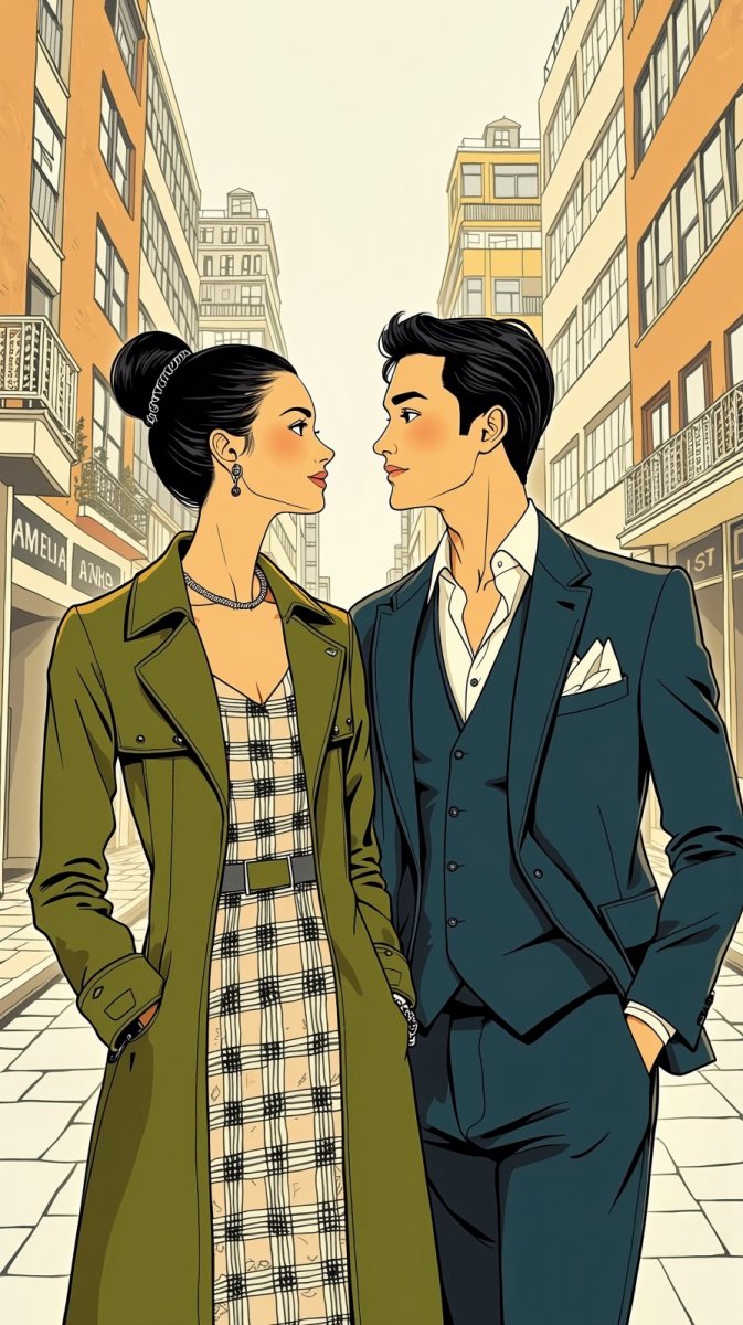 Изящный дуэт в ритме города – яркая иллюстрация, сочетающая элементы наивного искусства, дзен-тангла и мультяжной графики, выполненная в технике чернильной живописи с акцентом на смелые контуры и насыщенные градиенты. В центре внимания пара, воплощающая последние тенденции моды: женщина демонстрирует элегантность минимализма Miuccia Prada в лаконичном оливково-зеленом тренчкоте, дополненном геометрическим платьем, изящным цепочным поясом и скромными серьгами-гвоздиками. Её спутник излучает безупречный стиль Tom Ford в строгом темно-синем костюме с идеально выглаженной белой рубашкой и утонченной шелковой носовой платком, добавляющим образу завершенность. В их нежном взгляде друг на друга читается теплота и взаимное восхищение, создавая атмосферу гармонии и стиля в динамичном городском пейзаже. Картина передает ощущение современной романтики, где мода является отражением индивидуальности и вкуса, а любовь – вдохновением для создания неповторимого образа. Это визуальное воплощение изысканности и уверенности, демонстрирующее гармонию между классикой и современностью, создавая притягательный образ стильной пары в сердце мегаполиса