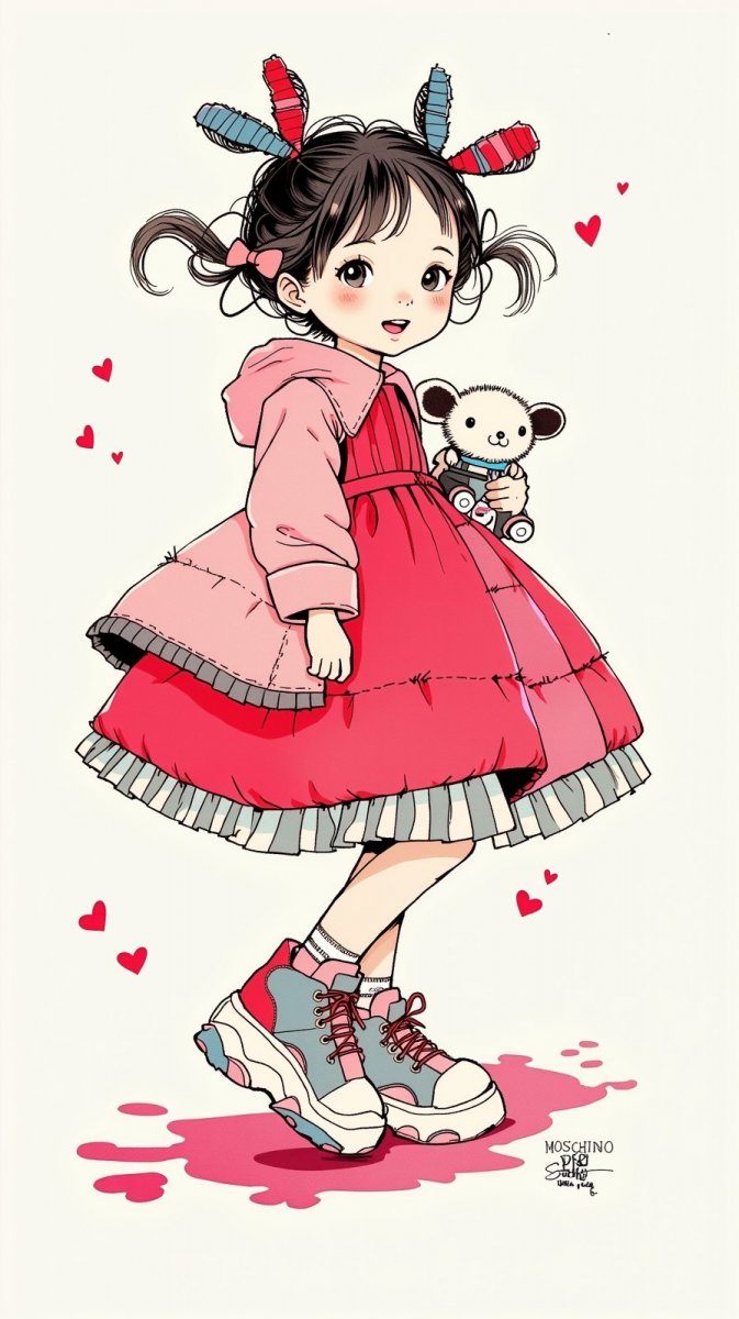 #4 Ink drawing, illustration, naive art, doodling, minimalism, featuring a fashionable little girl inspired by the playful designs of Comme des Garçons and the vibrant aesthetics of Moschino. She wears a voluminous, layered dress with different fabric textures in bright pinks and reds, complemented by quirky, oversized sneakers influenced by Moschino's whimsical touch. Her playful hairstyle features colorful clips, while she clutches a small plush toy, adding a touch of innocence and joy. Her delighted expression captures the essence of childhood wonder and creativity. #role_design